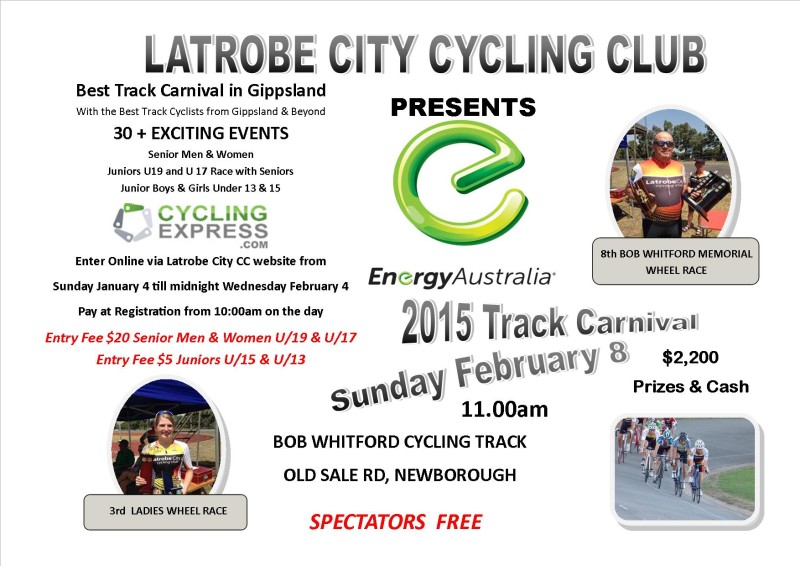 The Latrobe City Cycling Club is holding their track carnival on Sunday Feb 8.  We tend to do well there, so get along to show your support of track racing and clean up!