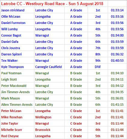 In the end, Jason Strickland (Latrobe) got up by 2 seconds for a maiden win over Ollie McLean (Leongatha). Daniel Furmston (Latrobe) was next, 42 seconds down and closely followed by Will Lumby (Leongatha). Conor Bagot, the best placed Warragul rider was next another 4 seconds back. The winning time was 01:33:14 for 60kms..