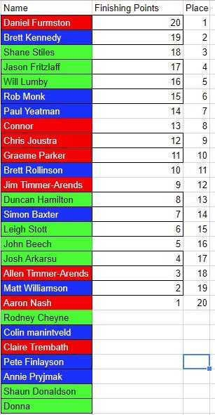 Furmston (R) came over Kennedy (B) who came over Stiles (G). Fritzlaff (G) was followed in by Lumby (G). Three green’s in the top five was enough to secure first place on 74 points. The red team came second with 69 and blue who fell apart in the last three kilometers came third with 67.